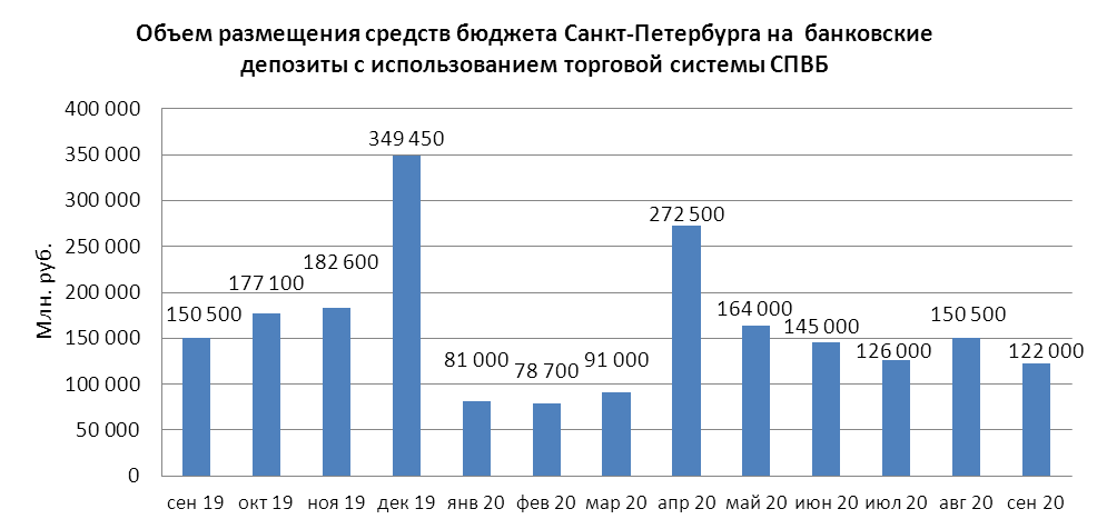 В сентябре 2020 года объем размещения средств бюджета Санкт-Петербурга на депозиты в уполномоченных банках с использованием торговой системы СПВБ составил 122,000 млрд. руб., в августе 2020 года – 150,500 млрд. руб.