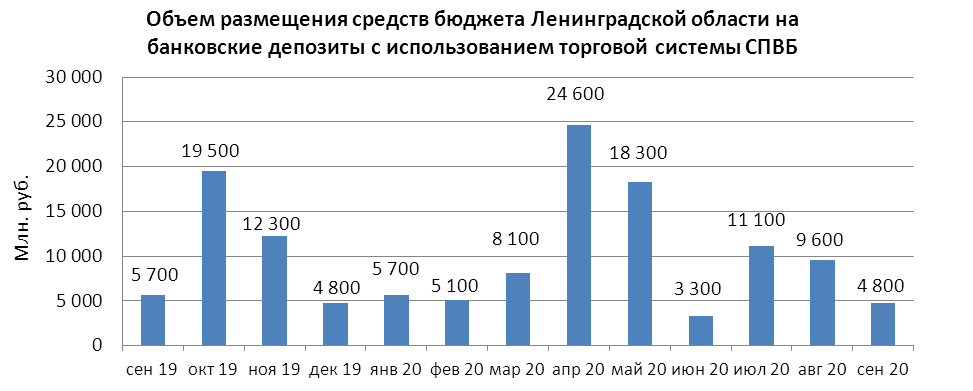 В сентябре 2020 г. объем размещения средств бюджета Ленинградской области на банковские депозиты в уполномоченных банках с использованием торговой системы СПВБ составил 4,800 млрд. руб., в августе 2020 года - 9,600 млрд. руб.