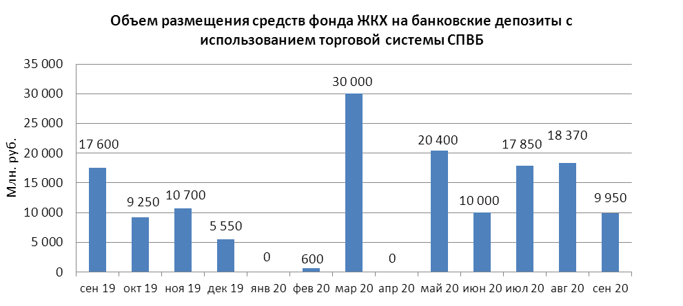 В сентябре 2020 года объем размещения временно свободных средств государственной корпорации - Фонд содействия реформированию жилищно-коммунального хозяйства на депозиты в уполномоченных банках с использованием торговой системы СПВБ составил 9,950 млрд. руб., в августе 2020 года - 18,370 млрд. руб.