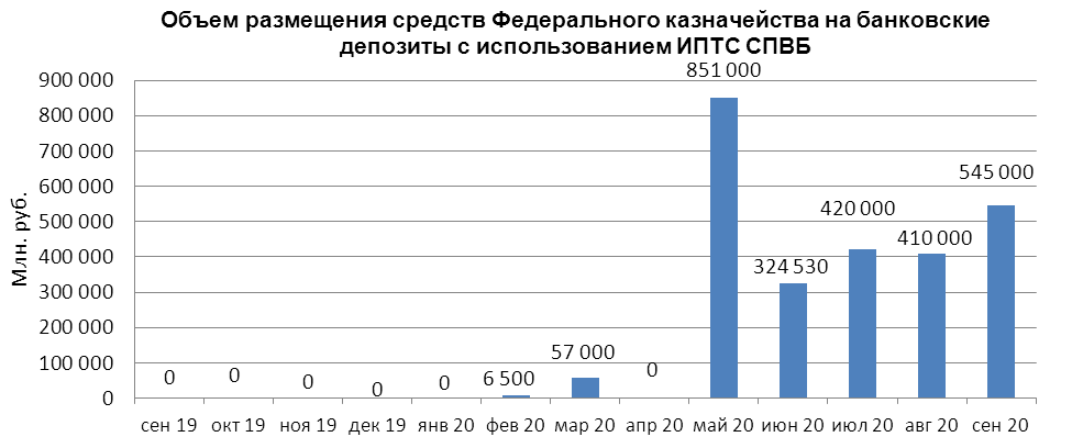 В сентябре 2020 г. объем размещения средств федерального бюджета на банковские депозиты, осуществленного Федеральным казначейством с использованием информационных программно-технических средств СПВБ, составил 545,000 млрд. руб., в августе 2020 года - 410,000 млрд. руб.