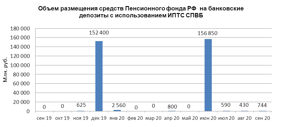 В сентябре 2020 г. объем размещения средств Пенсионного фонда Российской Федерации на банковские депозиты, осуществленного Пенсионным фондом с использованием информационных программно-технических средств СПВБ, составил 0,744 млрд. руб., в августе 2020 года - 0,430 млрд. руб.