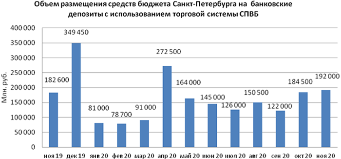 В ноябре 2020 года объем размещения средств бюджета Санкт-Петербурга на депозиты в уполномоченных банках с использованием торговой системы СПВБ составил 192,000 млрд. руб. и вырос на 4% по сравнению с объемом размещения в октябре 2020 года – 184,500 млрд. руб.