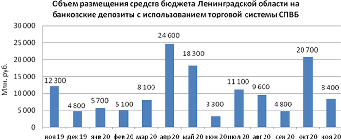 Объем размещения средств бюджета Ленинградской области на банковские депозиты в уполномоченных банках с использованием торговой системы СПВБ в ноябре 2020 года составил 8,400 млрд. руб. и сократился в 2,5 раза по отношению к объему размещения в октябре 2020 года - 20,700 млрд. руб.