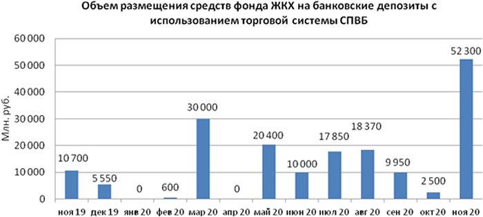 Объем размещения временно свободных средств государственной корпорации - Фонд содействия реформированию жилищно-коммунального хозяйства на депозиты в уполномоченных банках с использованием торговой системы СПВБ в ноябре 2020 года составил 52,300 млрд. руб. и вырос в 21 раз по отношению к объему размещения в октябре 2020 года - 2,500 млрд. руб.