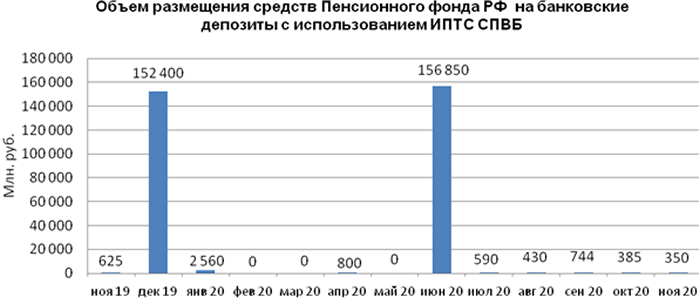 Объем размещения средств Пенсионного фонда Российской Федерации на банковские депозиты, осуществленного Пенсионным фондом с использованием информационных программно-технических средств СПВБ в ноябре 2020 года, составил 0,350 млрд. руб., продемонстрировав незначительное снижение объема размещения по отношению к с объему размещения в октябре 2020 года - 0,385 млрд. руб.