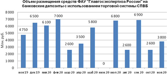 В ноябре 2020 г. объем размещения средств ФАУ «Главгосэкспертиза России» на банковские депозиты в уполномоченных банках составил 3,800 млрд. руб. и увеличился в 1,5 раза по сравнению с объемом размещения в октябре 2020 года - 2,600 млрд. руб.