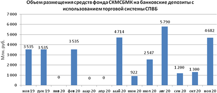 Объем размещения временно свободных средств некоммерческой организации “Фонд содействия кредитованию малого и среднего бизнеса, микрокредитная компания” на банковские депозиты в уполномоченных банках с использованием торговой системы СПВБ в ноябре 2020 года составил 4,682 млрд. руб., превысив в 3,6 раза уровень объема размещения в октябре 2020 года - 1,300 млрд. руб.