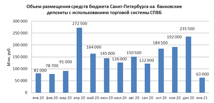 В январе 2021 года объем размещения средств бюджета Санкт-Петербурга на депозиты в уполномоченных банках с использованием торговой системы СПВБ составил 63,00 млрд. руб., в декабре 2020 года – 235,500 млрд. руб.