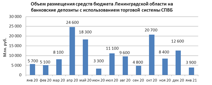 Объем размещения средств бюджета Ленинградской области на банковские депозиты в уполномоченных банках с использованием торговой системы СПВБ в январе 2021 года составил 3,900 млрд. руб., в декабре 2020 года - 12,600 млрд. руб.