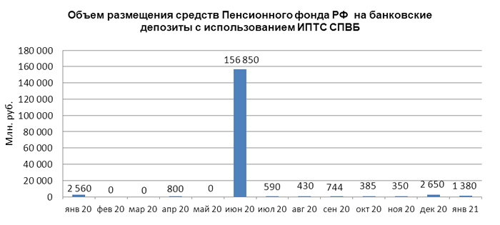 В январе 2021 года объем размещения средств Пенсионного фонда Российской Федерации на банковские депозиты, осуществленного Пенсионным фондом с использованием информационных программно-технических средств СПВБ, составил 1,380 млрд. руб., в декабре 2020 года - 2,650 млрд. руб.