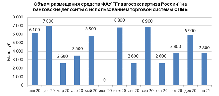 Объем размещения средств ФАУ "Главгосэкспертиза России" на банковские депозиты в уполномоченных банках в январе 2021 года составил 3,800 млрд. руб., в декабре 2020 года - 5,900 млрд. руб.