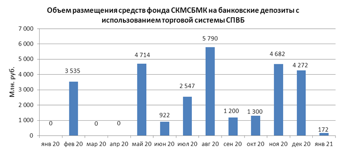 Объем размещения временно свободных средств некоммерческой организации “Фонд содействия кредитованию малого и среднего бизнеса, микрокредитная компания” на банковские депозиты в уполномоченных банках с использованием торговой системы СПВБ в январе 2021 года составил 0,172 млрд. руб., в декабре 2020 года - 4,272 млрд. руб.