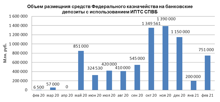 В феврале 2021 года объем размещения средств федерального бюджета на банковские депозиты, осуществленного Федеральным казначейством с использованием информационных программно-технических средств СПВБ, составил 751,000 млрд. руб., превысив в 3,8 раза объем размещения в январе 2021 года - 200,000 млрд. руб.