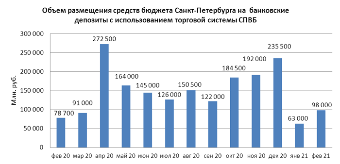 Объем размещения средств бюджета Санкт-Петербурга на депозиты в уполномоченных банках с использованием торговой системы СПВБ в феврале 2021 года составил 98,000 млрд. руб. и вырос на 55,6% по отношению к объему размещения в январе 2021 года – 63,000 млрд. руб.