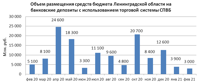 Объем размещения средств бюджета Ленинградской области на банковские депозиты в уполномоченных банках с использованием торговой системы СПВБ составил 3,000 млрд. руб. и снизился на 23,1% по сравнению с объемом размещения в январе 2021 года - 3,900 млрд. руб.
