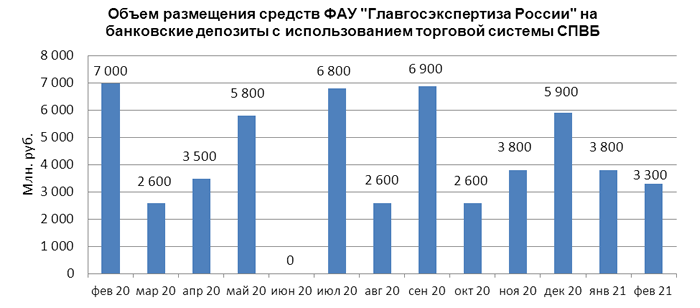 Объем размещения средств ФАУ «Главгосэкспертиза России» на банковские депозиты в уполномоченных банках в феврале 2021 года составил 3,300 млрд. руб., сократившись на 13% по отношению к объему размещения в январе 2021 года - 3,800 млрд. руб.