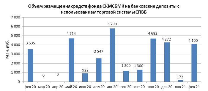 Объем размещения временно свободных средств некоммерческой организации “Фонд содействия кредитованию малого и среднего бизнеса, микрокредитная компания” на банковские депозиты в уполномоченных банках с использованием торговой системы СПВБ в феврале 2021 года составил 4,100 млрд. руб., значительно превысив объем размещения в январе 2021 года - 0,172 млрд. руб.