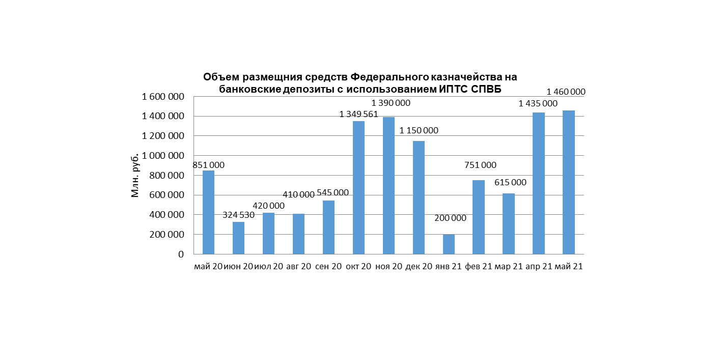 В мае 2021 г. объем размещения средств федерального бюджета в банковские депозиты, осуществленного Федеральным казначейством с использованием информационных программно-технических средств СПВБ, составил 1 460,000 млрд. руб., в апреле 2021 года - 1 435,000 млрд. руб.