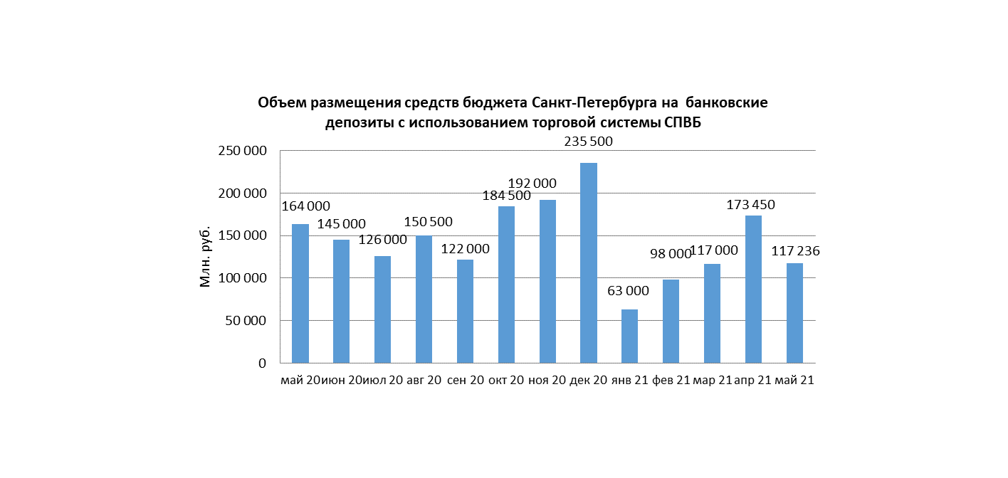 В мае 2021 года объем размещения средств бюджета Санкт-Петербурга в депозиты в уполномоченных банках с использованием торговой системы СПВБ составил 117,236 млрд.руб., в апреле 2021 года – 173,450 млрд.руб.