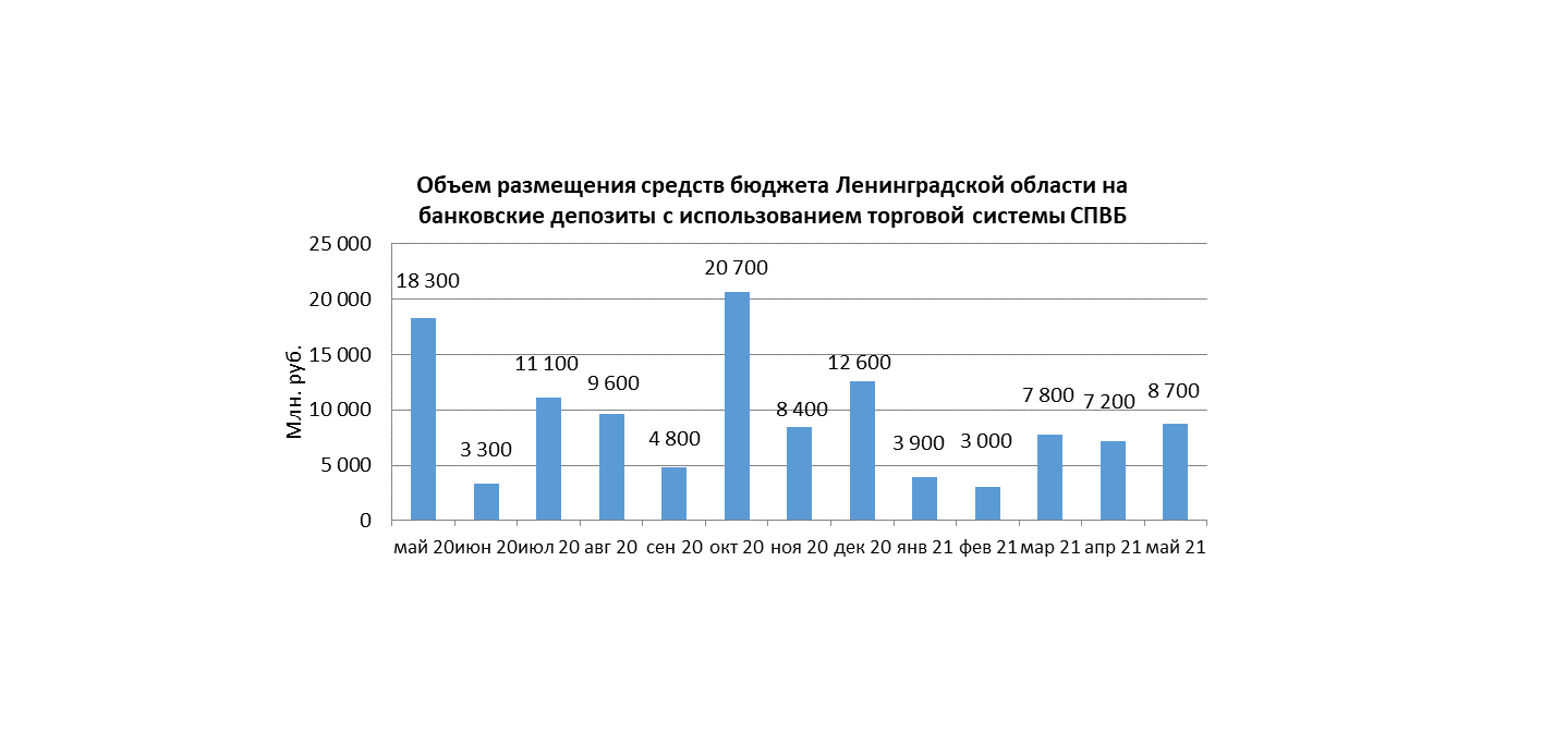 В мае 2021 г. объем размещения средств бюджета Ленинградской области в банковские депозиты в уполномоченных банках с использованием торговой системы СПВБ составил 8,700 млрд. руб., в апреле 2021 года - 7,200 млрд. руб.