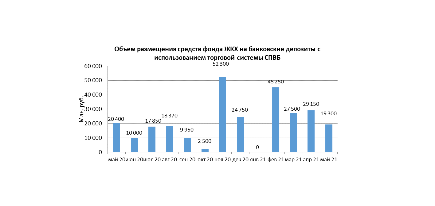 В мае 2021 года объем размещения временно свободных средств государственной корпорации - Фонд содействия реформированию жилищно-коммунального хозяйства в депозиты в уполномоченных банках с использованием торговой системы СПВБ составил 19,300 млрд. руб., в апреле 2021 года - 29,150 млрд. руб.