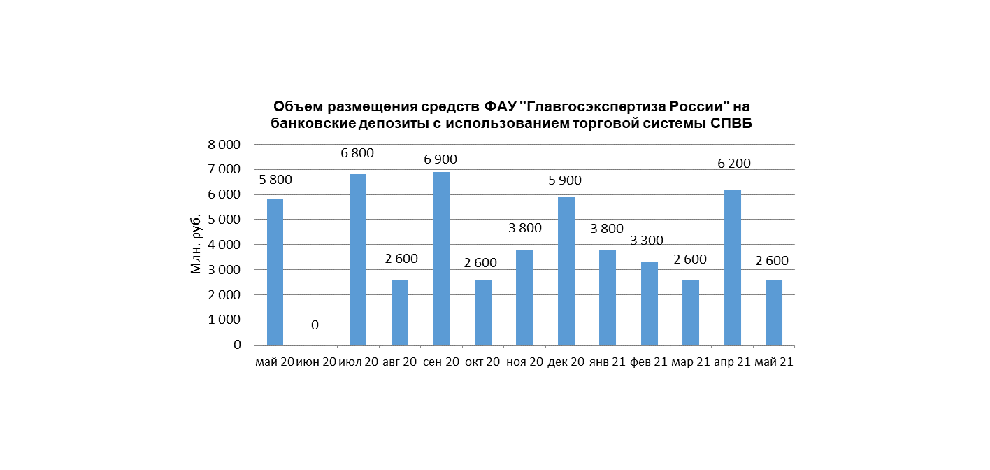 В мае 2021 г. объем размещения средств ФАУ «Главгосэкспертиза России» в банковские депозиты в уполномоченных банках составил 2,600 млрд. руб., в апреле 2021 года - 6,200 млрд. руб.