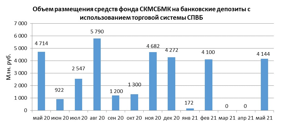 В мае 2021 года объем размещения временно свободных средств некоммерческой организации “Фонд содействия кредитованию малого и среднего бизнеса, микрокредитная компания” в банковские депозиты в уполномоченных банках с использованием торговой системы СПВБ составил 4,144 млрд. руб., в апреле 2021 года операции не осуществлялись.
