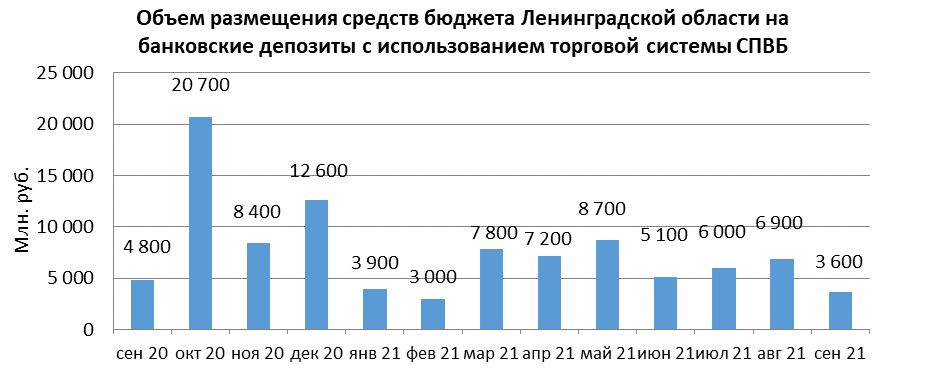 В сентябре 2021 г. объем размещения средств бюджета Ленинградской области в банковские депозиты в уполномоченных банках с использованием торговой системы СПВБ составил 3,600 млрд. руб., в августе 2021 года - 6,900 млрд. руб.