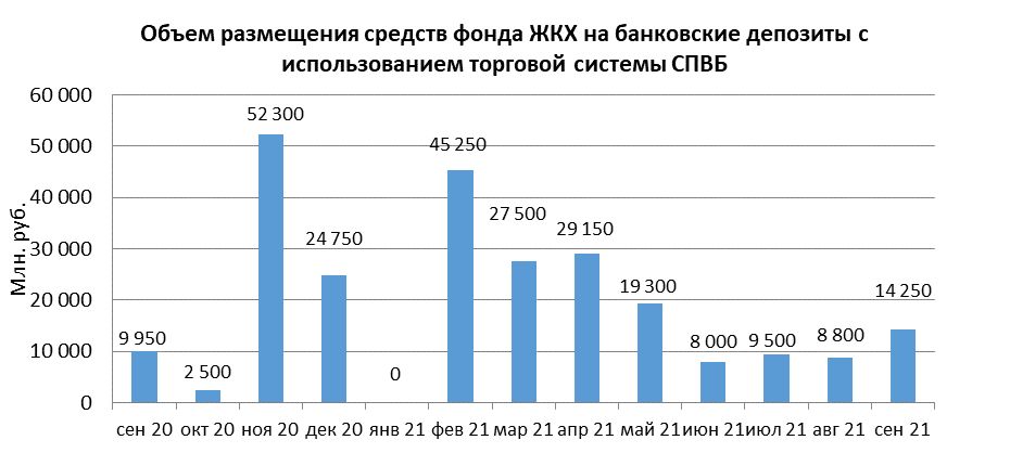 В сентябре 2021 года объем размещения временно свободных средств государственной корпорации - Фонд содействия реформированию жилищно-коммунального хозяйства в депозиты в уполномоченных банках с использованием торговой системы СПВБ составил 14,250 млрд. руб., в августе 2021 года - 8,800 млрд. руб.