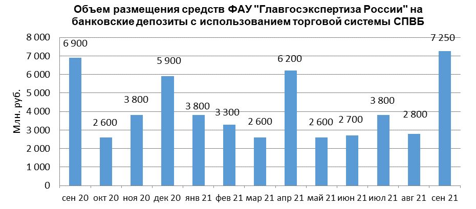 В сентябре 2021 г. объем размещения средств ФАУ «Главгосэкспертиза России» в банковские депозиты в уполномоченных банках с использованием торговой системы СПВБ составил 7,250 млрд. руб., в августе 2021 года - 2,800 млрд. руб.