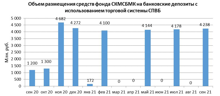 В сентябре 2021 года размещение временно свободных средств некоммерческой организации “Фонд содействия кредитованию малого и среднего бизнеса, микрокредитная компания” в банковские депозиты в уполномоченных банках с использованием торговой системы СПВБ составил 4,238 млрд. руб., в августе 2021 года в банковские депозиты в уполномоченных банках с использованием торговой системы СПВБ не осуществлялось