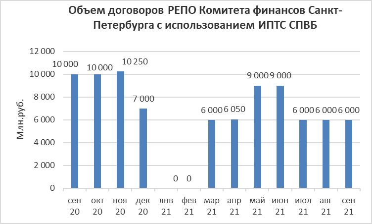 Объем договоров РЕПО Комитета финансов Санкт-Петербурга, заключенных с кредитными организациями с использованием информационных программно-технических средств СПВБ, в сентябре 2021 года составил 6,000 млрд. руб., в августе 2021 года - 6,000 млрд. руб.