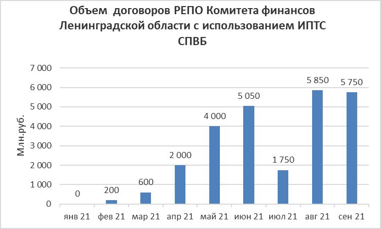 Объем заключенных договоров РЕПО с Комитетом финансов Ленинградской области, заключенных с кредитными организациями с использованием информационных программно-технических средств СПВБ, в сентябре 2021 года составил 5,750 млрд. руб., в августе 2021 года - 5,850 млрд. руб.