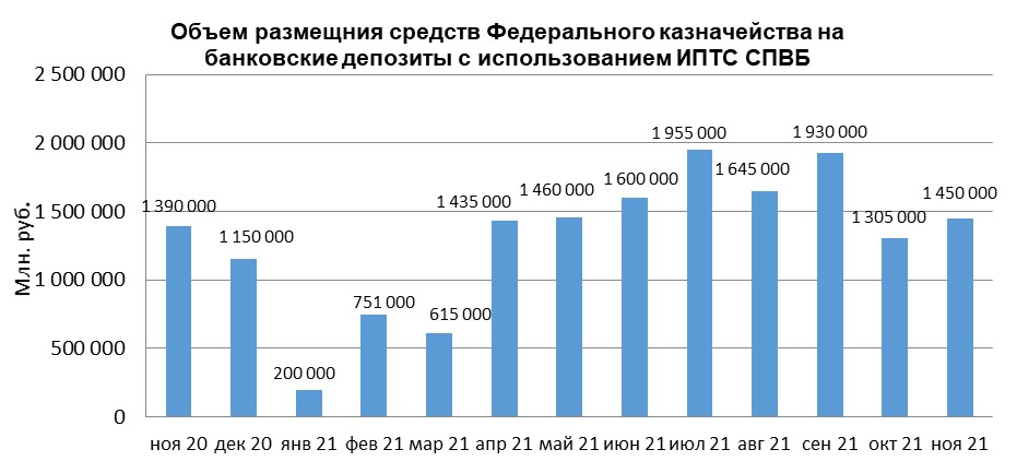 В ноябре 2021 г. объем размещения средств федерального бюджета в банковские депозиты, осуществленного Федеральным казначейством с использованием информационных программно-технических средств СПВБ, составил 1 450,000 млрд. руб., в октябре 2021 года - 1 305,000 млрд. руб.