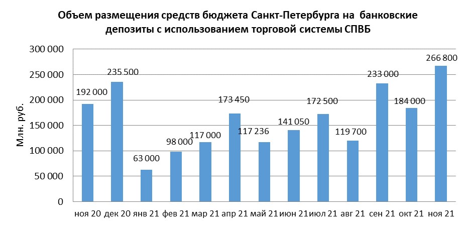 В ноябре 2021 года объем размещения средств бюджета Санкт-Петербурга в депозиты в уполномоченных банках с использованием торговой системы СПВБ составил 266,800 млрд. руб., в октябре 2021 года – 184,000 млрд. руб.