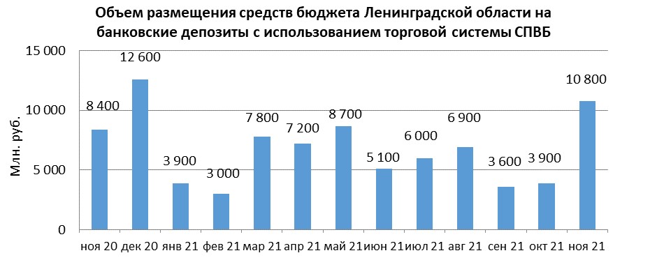 В ноябре 2021 г. объем размещения средств бюджета Ленинградской области в банковские депозиты в уполномоченных банках с использованием торговой системы СПВБ составил 10,800 млрд. руб., в октябре 2021 года – 3,900 млрд. руб.