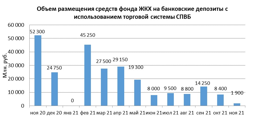 В ноябре 2021 года объем размещения временно свободных средств государственной корпорации - Фонд содействия реформированию жилищно-коммунального хозяйства в депозиты в уполномоченных банках с использованием торговой системы СПВБ составил 1,900 млрд. руб., в октябре 2021 года - 8,400 млрд. руб.
