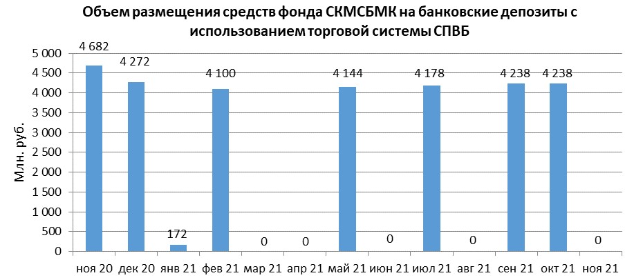В ноябре 2021 года размещение временно свободных средств некоммерческой организации “Фонд содействия кредитованию малого и среднего бизнеса, микрокредитная компания” в банковские депозиты в уполномоченных банках с использованием торговой системы СПВБ не осуществлялось, в октябре 2021 года в банковские депозиты в уполномоченных банках с использованием торговой системы СПВБ составил 4,238 млрд. руб.,