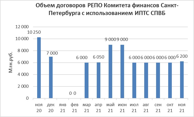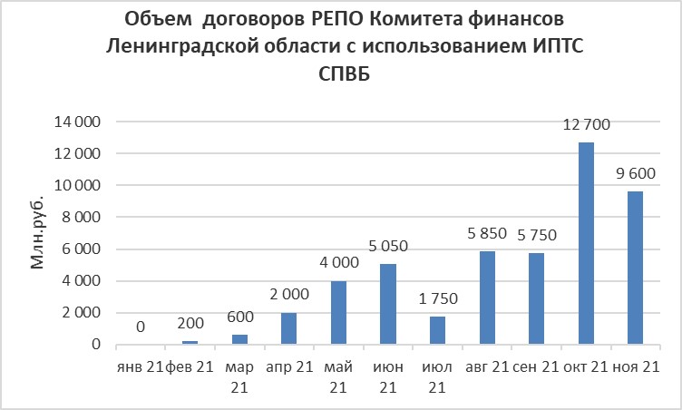 Объем договоров РЕПО с Комитетом финансов Ленинградской области, заключенных с кредитными организациями с использованием информационных программно-технических средств СПВБ, в ноябре 2021 года составил 9,600 млрд. руб., в октябре 2021 года - 12,700 млрд. руб.