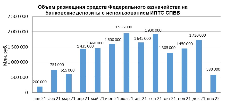 В январе 2022 г. объем размещения средств федерального бюджета в банковские депозиты, осуществленного Федеральным казначейством с использованием информационных программно-технических средств СПВБ, составил 580 млрд. руб., в декабре 2021 года - 1 730 млрд. руб.