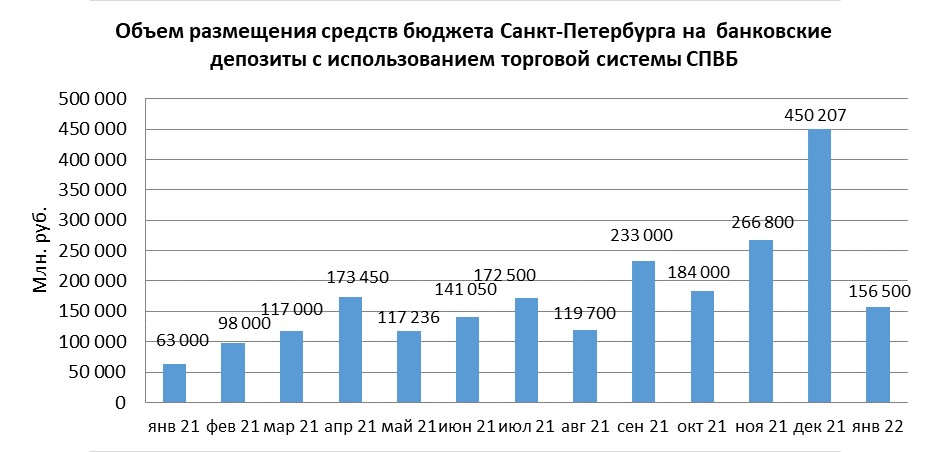 В январе 2022 года объем размещения средств бюджета Санкт-Петербурга в депозиты в уполномоченных банках с использованием торговой системы СПВБ составил 156,5 млрд. руб., в декабре 2021 года – 450,2 млрд. руб.