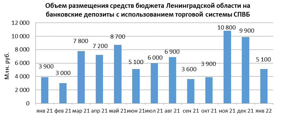В январе 2022 г. объем размещения средств бюджета Ленинградской области в банковские депозиты в уполномоченных банках с использованием торговой системы СПВБ составил 5,1 млрд. руб., в декабре 2021 года – 9,9 млрд. руб.