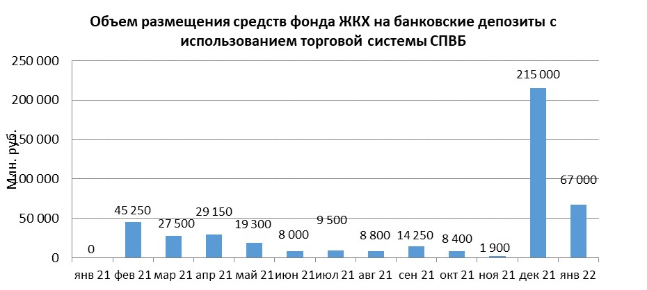 В январе 2022 года объем размещения временно свободных средств государственной корпорации - Фонд содействия реформированию жилищно-коммунального хозяйства в депозиты в уполномоченных банках с использованием торговой системы СПВБ составил 67 млрд. руб., в декабре 2021 года – 215 млрд. руб.