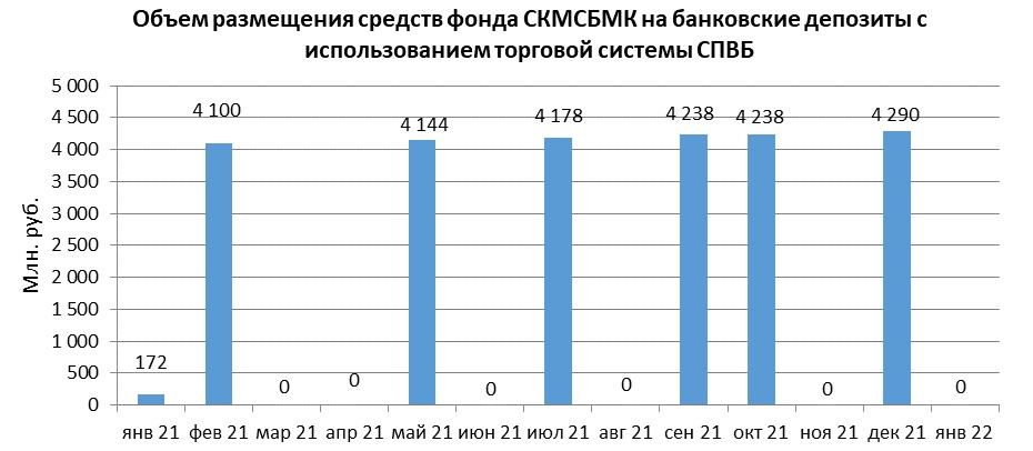 В январе 2022 года размещение временно свободных средств некоммерческой организации “Фонд содействия кредитованию малого и среднего бизнеса, микрокредитная компания” в банковские депозиты в уполномоченных банках с использованием торговой системы СПВБ не осуществлялось, в декабре 2021 года объем размещения в банковские депозиты в уполномоченных банках с использованием торговой системы СПВБ составил 4,3 млрд. руб.