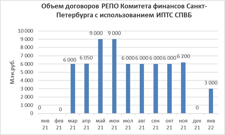 Объем договоров РЕПО Комитета финансов Санкт-Петербурга с кредитными организациями с использованием информационных программно-технических средств СПВБ в январе 2022 года составил 3 млрд. руб., в декабре 2021 года заключение договоров не осуществлялось.