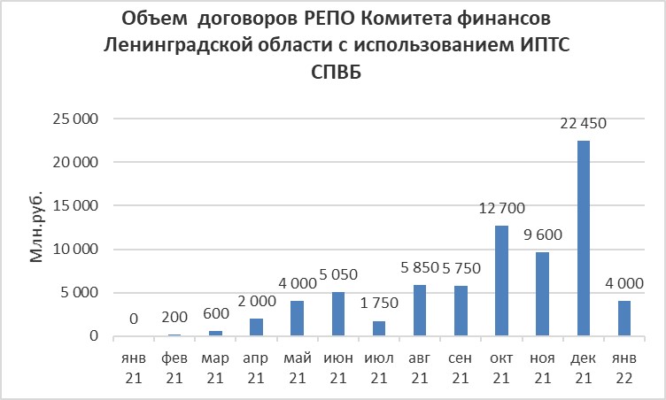 Объем заключенных договоров РЕПО с Комитетом финансов Ленинградской области, заключенных с кредитными организациями с использованием информационных программно-технических средств СПВБ, в январе 2022 года составил 4 млрд. руб., в декабре 2021 года - 22,5 млрд. руб.