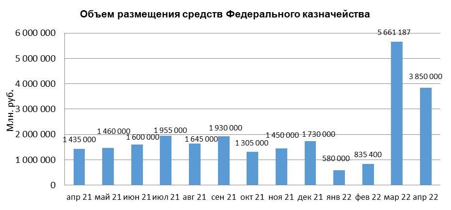В апреле 2022 г. объем размещения средств Федерального казначейства в депозиты кредитных организаций с использованием информационных программно-технических средств СПВБ, составил 3 850 млрд. руб., в марте 2022 года - 5 661,2 млрд. руб.