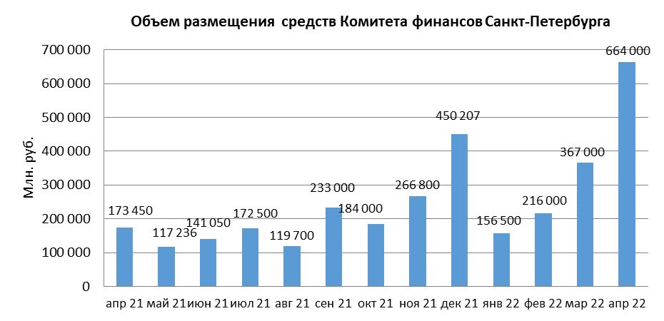 В апреле 2022 года объем размещения средств Комитета финансов Санкт-Петербурга в депозиты кредитных организаций с использованием информационных программно-технических средств СПВБ составил 664 млрд. руб., в марте 2022 года – 367 млрд. руб.