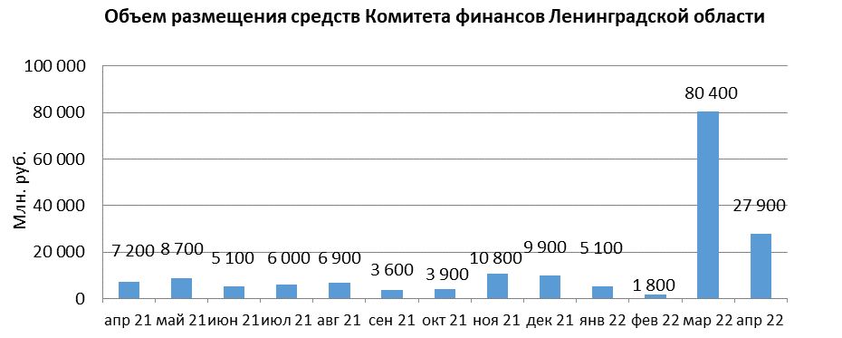 В апреле 2022 года объем размещения средств Комитета финансов Ленинградской области в депозиты кредитных организаций с использованием информационных программно-технических средств СПВБ составил 27,9 млрд. руб., в марте 2022 года – 80,4 млрд. руб.