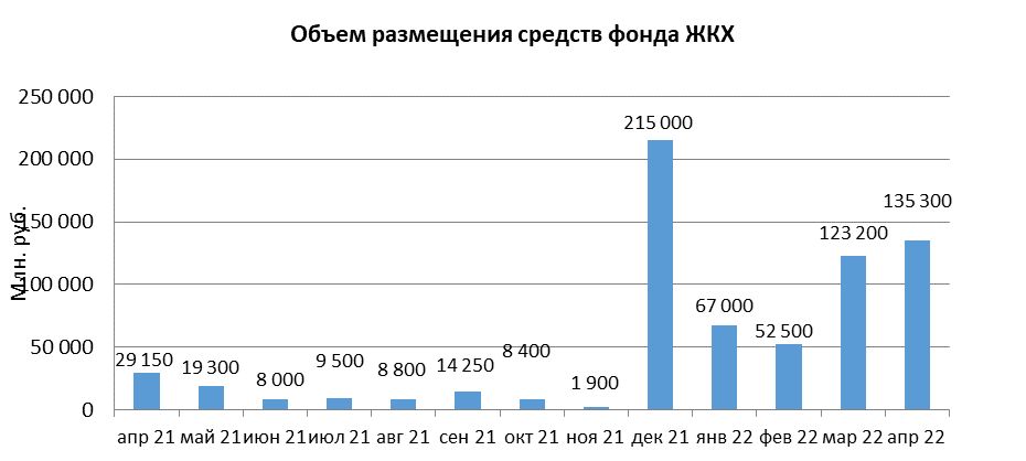 В апреле 2022 года объем размещения средств государственной корпорации - Фонд содействия реформированию жилищно-коммунального хозяйства в депозиты кредитных организаций с использованием информационных программно-технических средств СПВБ составил 135,3 млрд. руб., в марте 2022 года – 123,2 млрд. руб.